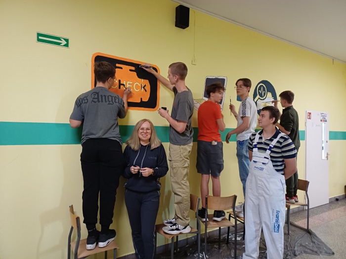 Uczniowie z sekcji medialno- plastycznej SU w składzie:Eryk Kuczyński, Sebastian Skrzypczak z kl.3eT, Mateusz Sulecki, Marcel Zieliński z kl.1aT, Artur Szczepański, Tomasz Zdunowski z kl. 1bT, Jan Chaberski, Łukasz Zadrożny z kl. 1dT wykonali malowidła ścienne na korytarzu I piętra. Pracowali pod kierunkiem p. Lidii Dragon i p. Dariusza Raczkowskiego.