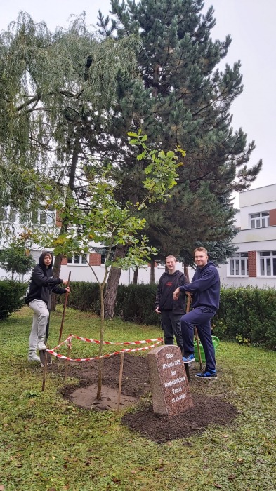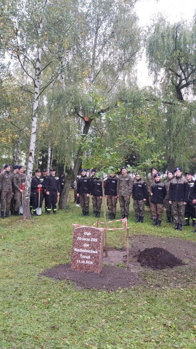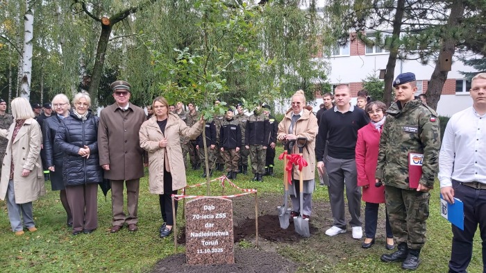 8 października 2025r. z inicjatywy p. Renaty Staszkiewicz i p. Ewy Słupczewskiej, przy wsparciu p. Lidii Dragon i Zarządu Samorządu Uczniowskiego odbyła się uroczystość wsadzenia dębu upamiętniającego Jubileusz 70-lecia istnienia naszej szkoły. Zaszczycili nas swoją obecnością: Nadleśniczy Nadleśnictwa Toruń p. Bogusław Kashyna oraz przedstawicielka Wydziału Edukacji p. Iwona Kempińska. Goście wspólnie z p. dyrektor Karoliną Guzińska, p. wicedyrektor Aliną Piekańską i organizatorkami symbolicznie zasypali korzenie drzewka w ziemi.