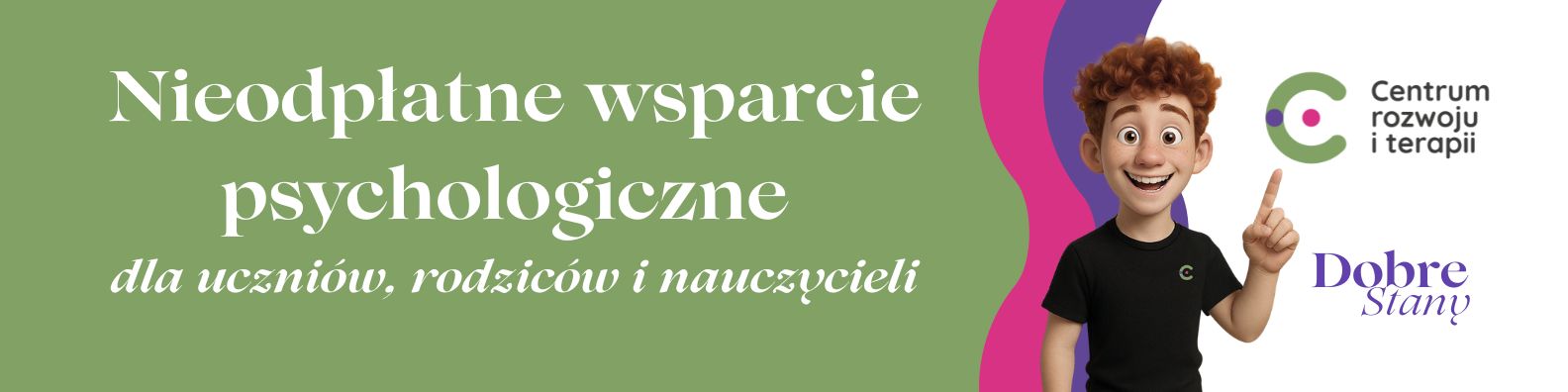 Centrum Rozwoju i Terapii w ramach realizacji Programu pomocy psychologicznej „DobreStany”, zaprasza do zapisów na nieodpłatne wsparcie psychologiczne. Grupę docelową programu stanowią uczniowie klas VI–VIII szkół podstawowych oraz młodzież szkół ponadpodstawowych (liceów i techników) ze szkół, których organem prowadzącym jest Gmina Miasta Toruń, a także ich rodzice i nauczyciele.