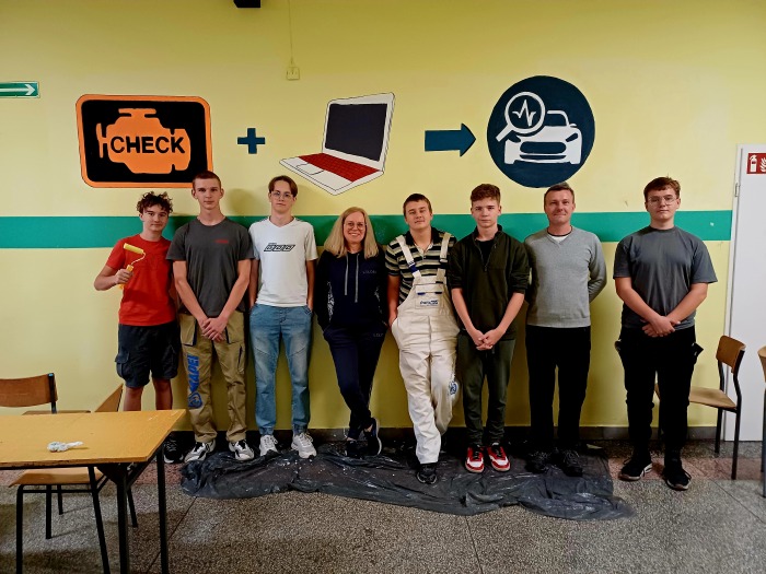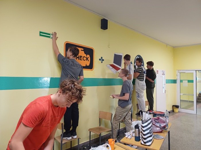 Uczniowie z sekcji medialno- plastycznej SU w składzie:Eryk Kuczyński, Sebastian Skrzypczak z kl.3eT, Mateusz Sulecki, Marcel Zieliński z kl.1aT, Artur Szczepański, Tomasz Zdunowski z kl. 1bT, Jan Chaberski, Łukasz Zadrożny z kl. 1dT wykonali malowidła ścienne na korytarzu I piętra. Pracowali pod kierunkiem p. Lidii Dragon i p. Dariusza Raczkowskiego.